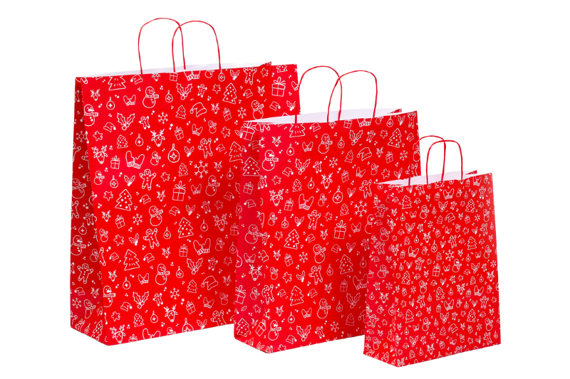 Papiertasche Weihnachtsmix – drei Größen schlicht rot bedruckt mit jeder Menge Platz für die Einkäufe deiner Kunden. Ob Weihnachtsbaum, Eiskristalle, Handschuhe, Mütze, Geschenke oder Elche – bei jedem Draufblicken kann man wieder Neues entdecken. Einfach perfekt, um fröhliche Weihnachtsstimmung beim Einkauf zu entfachen.